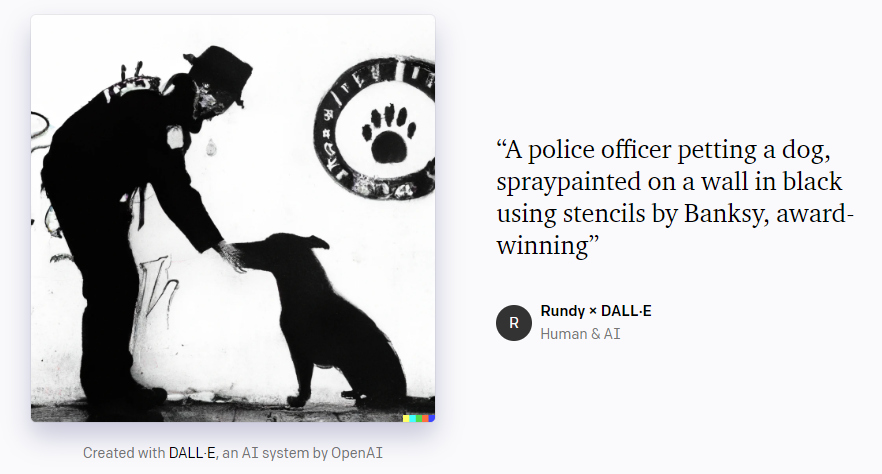 | A police officer petting a dog, spray painted on a wall in black using stencils by Banksy, award-winning | Stencil | A police officer petting a dog, spray painted on a wall in black | Artist- street art, BanksyModifier- award-winning |