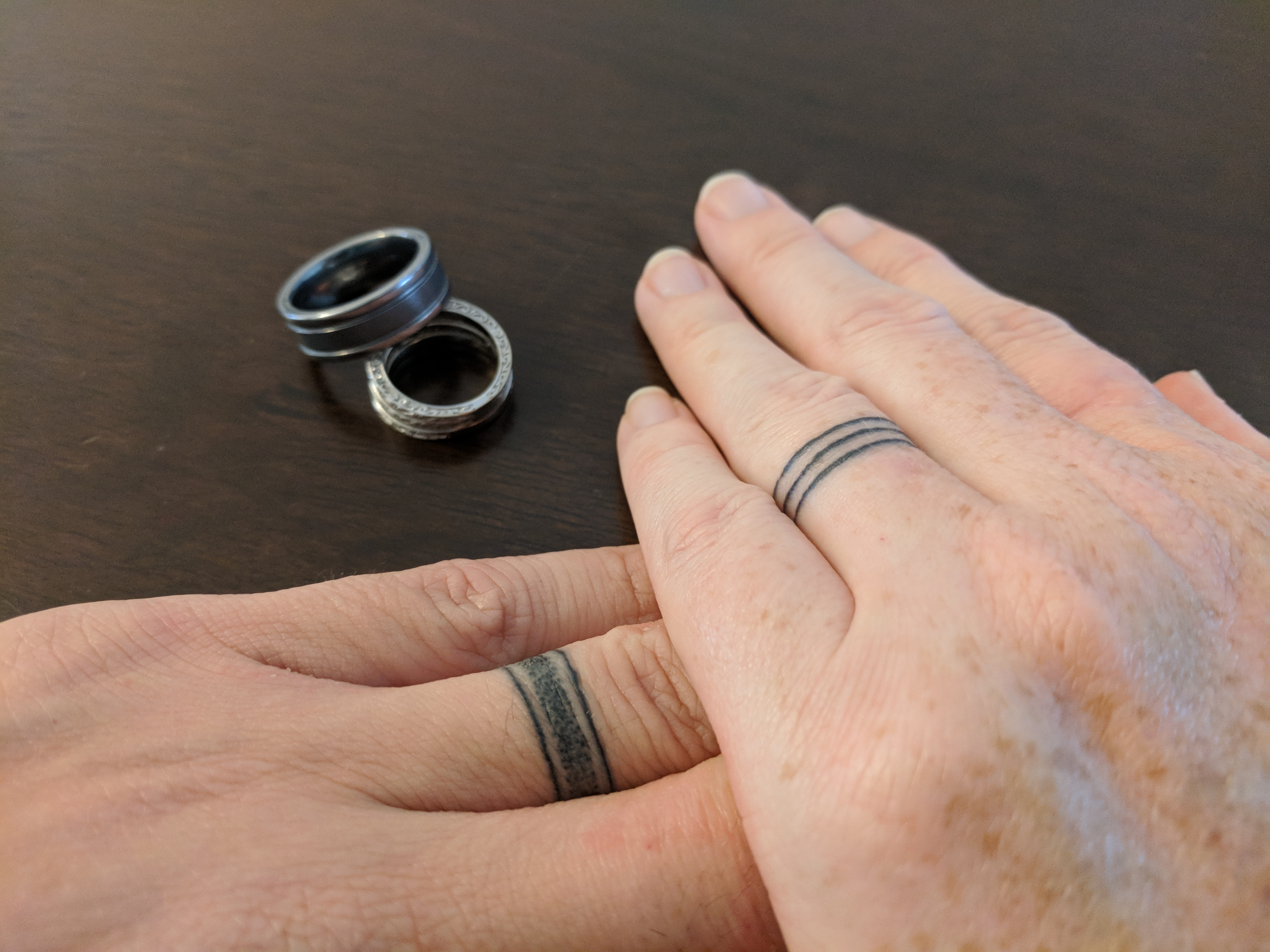 I tracked down and hired a long-lost friend to take some symbols and produce concept art for my tattoo. I even convinced Mike to have our wedding rings inked at the same time.